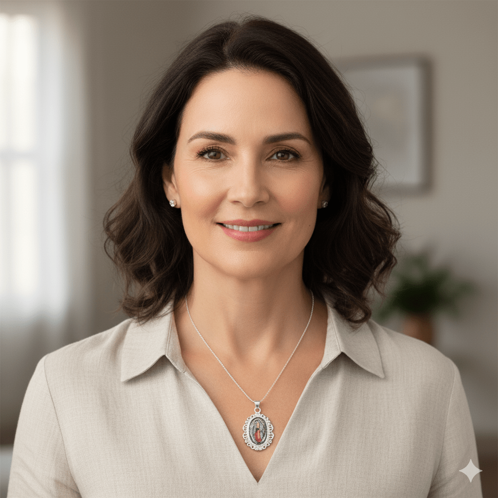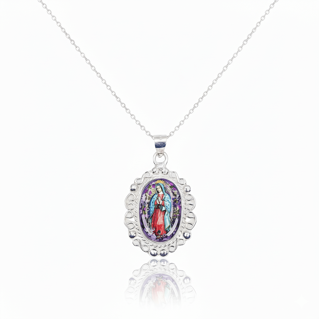 This gorgeous Guadalupe Baroque Sterling Silver Floral Medallion Necklace, crafted from authentic Mexican silver, is intricately adorned with pressed wildflowers, making it a stunning accessory for any occasion. Its intricate details are perfect for that religious look without sacrificing style.
