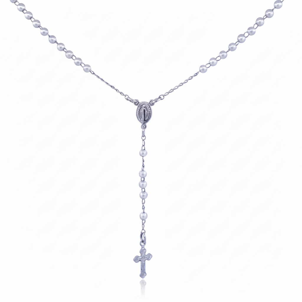 Silver-Plated Tiny Beads Pearl Our Lady of Grace Rosary Necklace 18-inch