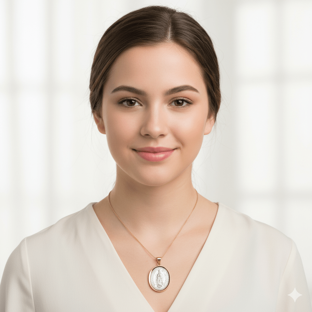 • Religious image of 'Nuestra Señora de Guadalupe' on the front of the medal.