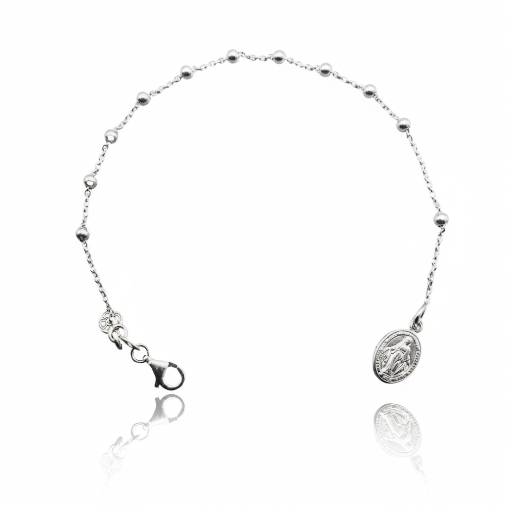 Transform your prayer life with this stunning, miraculous medal bracelet of superior quality. Expertly crafted in Italy with the finest sterling silver, each bead leads to a cherished Miraculous Medal charm. This elegant accessory is presented in a pristine white box, making it a perfect and meaningful gift for yourself or your loved ones. Don't wait any longer to enhance your prayer life; get your hands on this exquisite bracelet now!