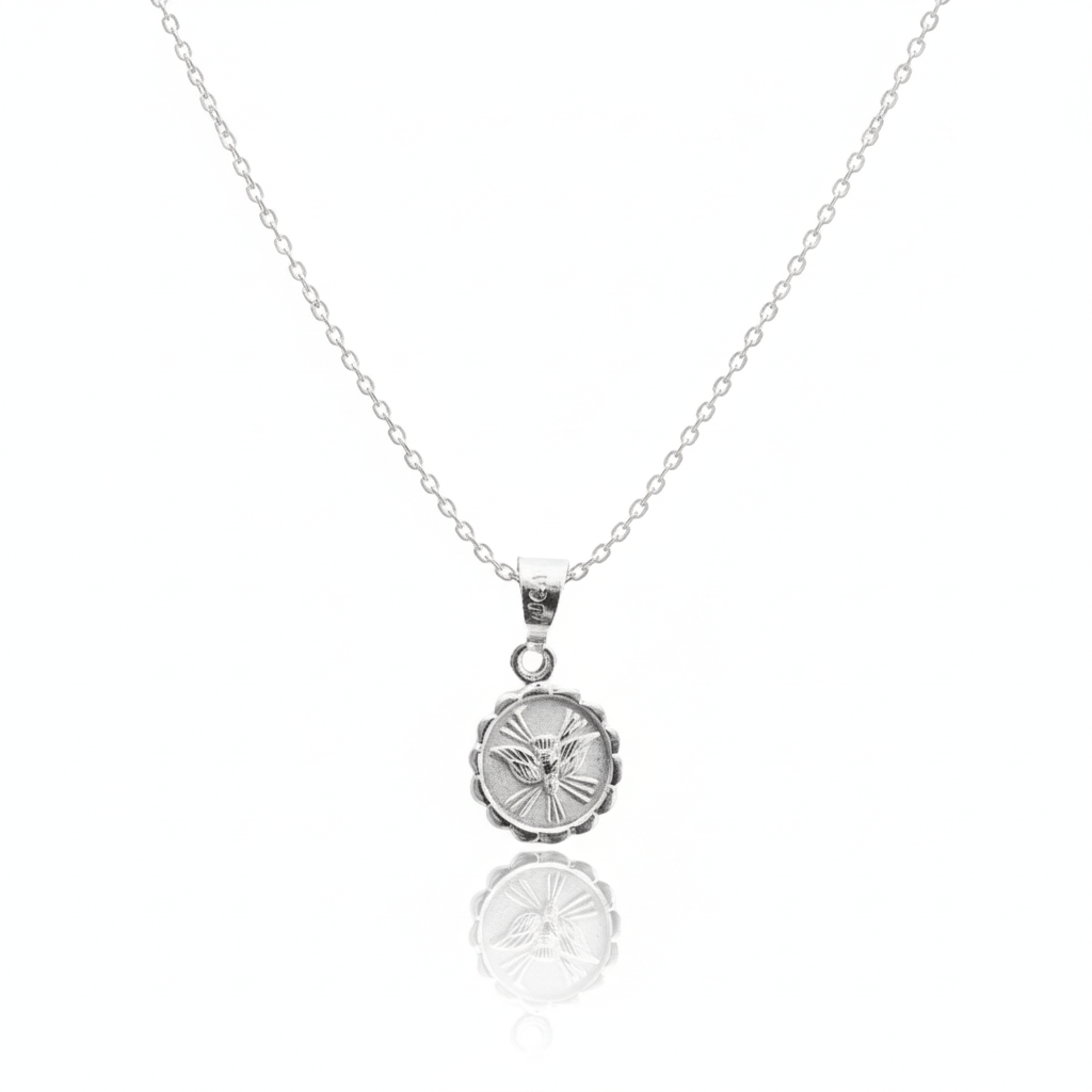 Fashioned from genuine Mexican sterling silver, this beautiful round pendant necklace features a stunning image of the Holy Spirit painstakingly crafted onto its surface. The border boasts magnificent curved embellishments while the matte backdrop contrasts with the medal's intricate detailing and silver tones.
