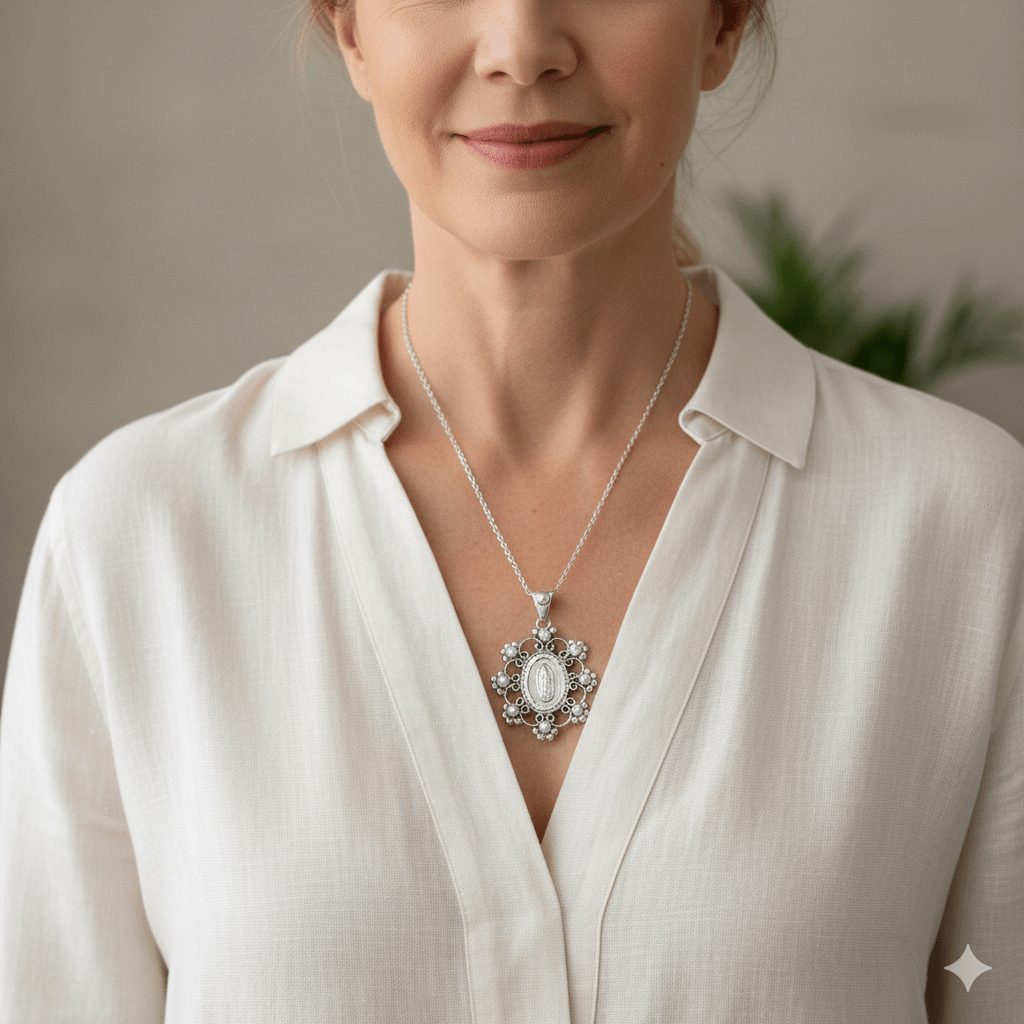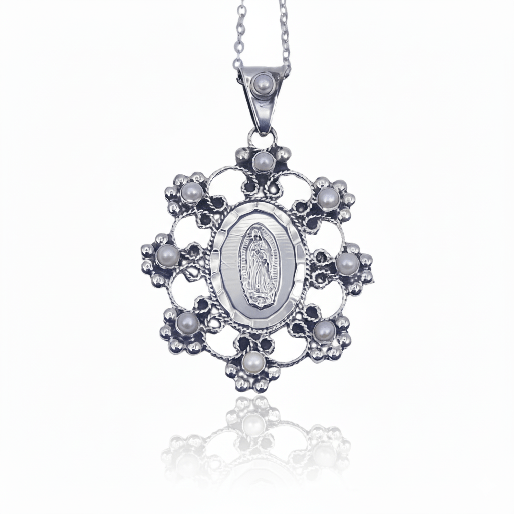 The Our Lady of Guadalupe medallion is a beautiful piece of jewelry that showcases the iconic image of Our Lady of Guadalupe. Handcrafted in Taxco, Mexico, this Our Lady of Guadalupe pendant is made from sterling silver and features intricate baroque detailing. It measures 1.1" x 1.2" and is adorned with delicate pearls, adding an elegant touch to the design.