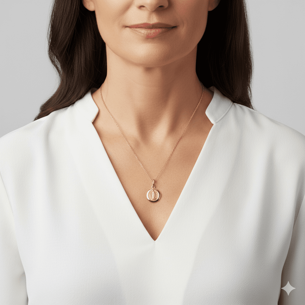 This Scapular Religious Necklace is a direct import from the Basílica de Nuestra Señora de Guadalupe. It features a miniature scapular pendant with Our Lady of Guadalupe in a gold finish, along with an adjustable loopback clasp. This beautiful jewelry honors the Blessed Mother and will be cherished for years, making it the perfect accessory to express your faith.