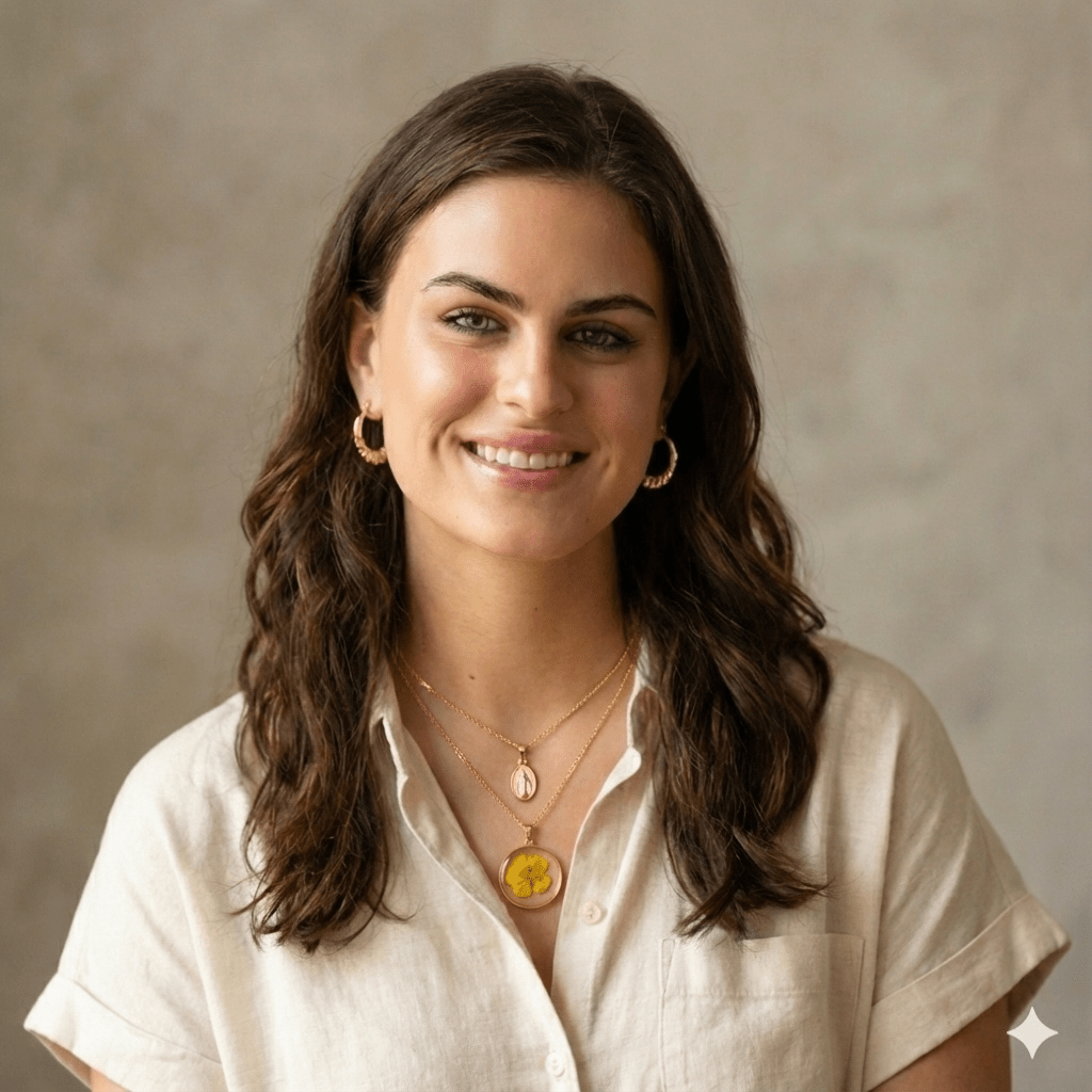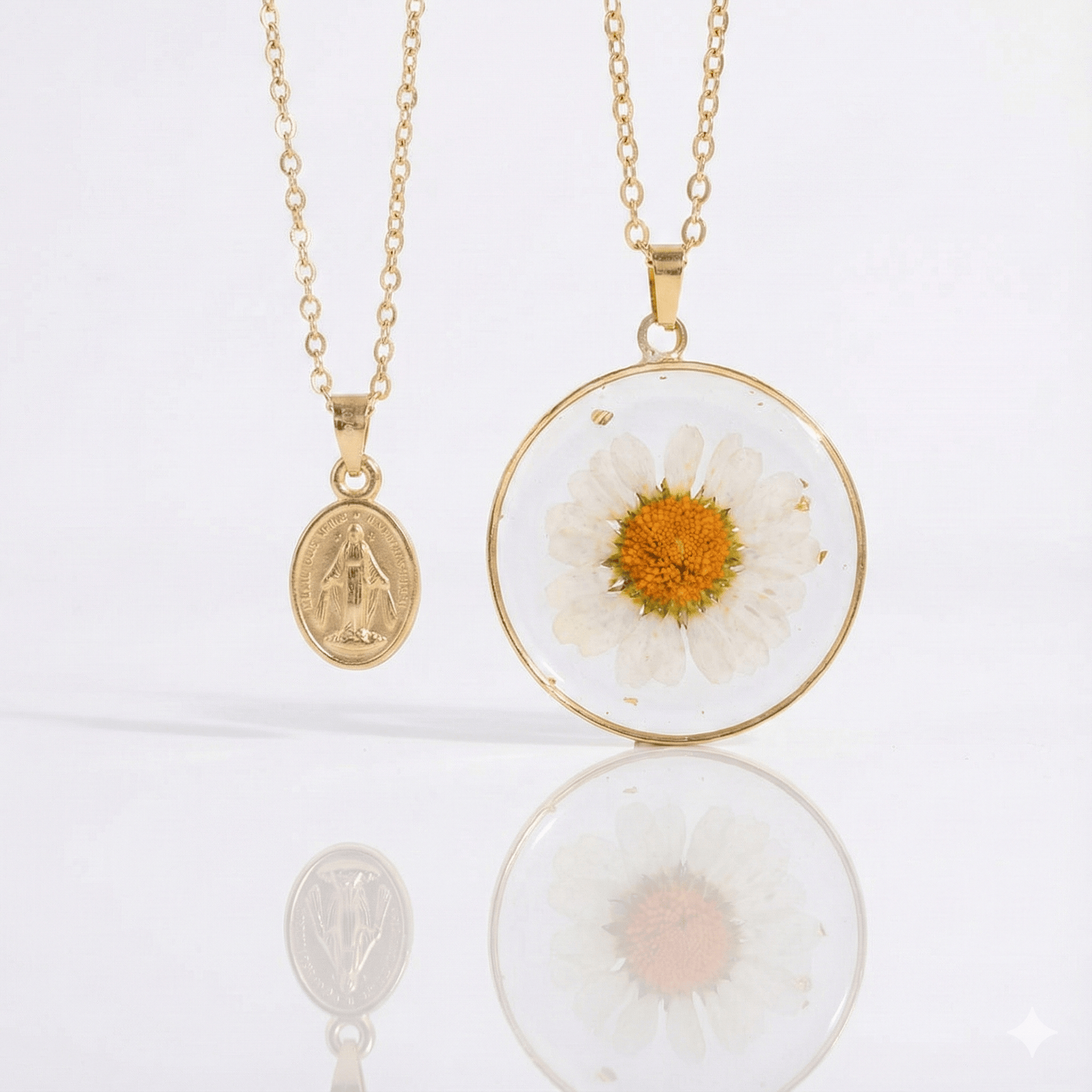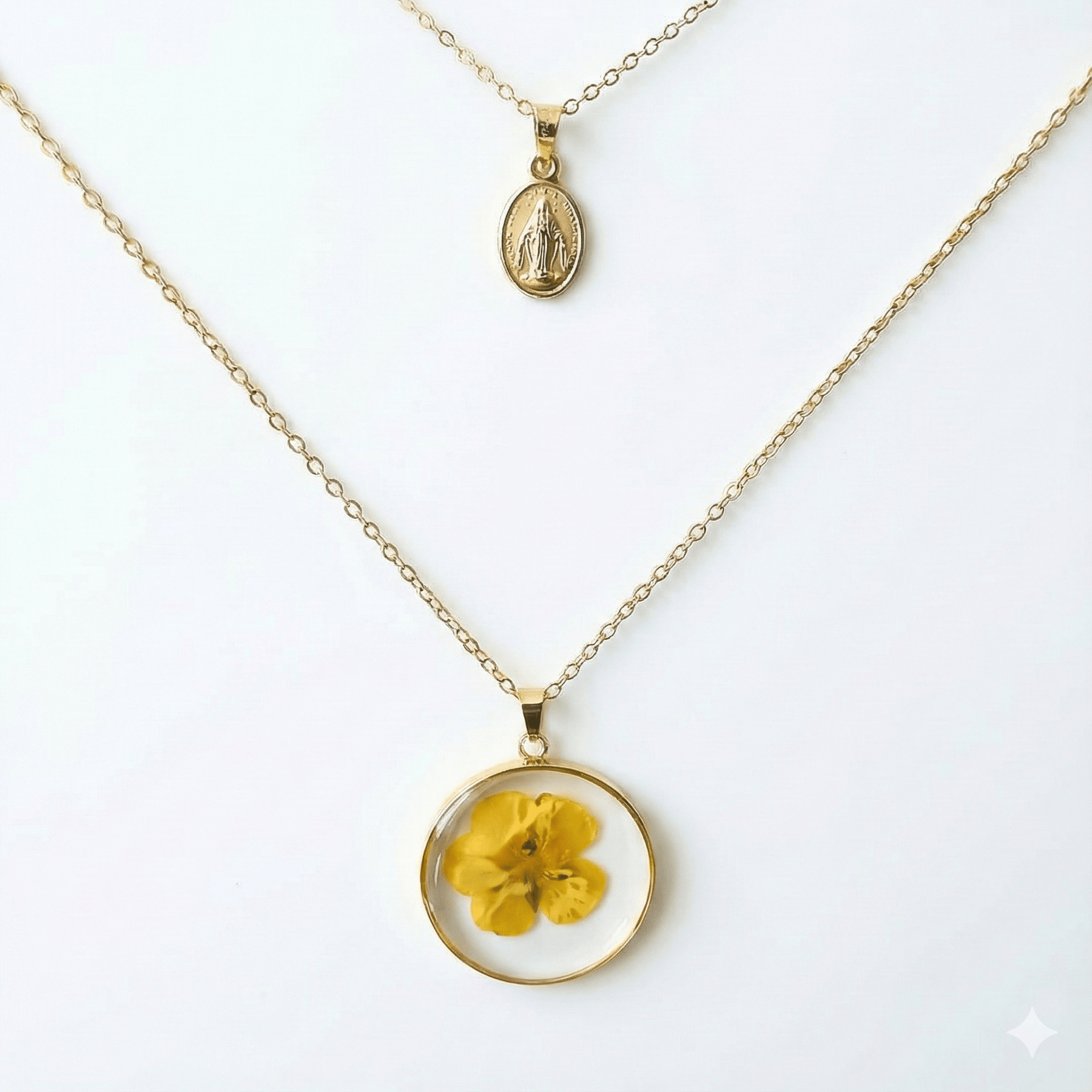 The first necklace showcases a dazzling resin pendant meticulously adorned with dried flowers, encapsulating the charm of artisan craftsmanship. The second piece is an inspiring Virgin Mary pendant, representing a stunning symbol of your faith. Both charms, crafted from long-lasting gold-filled and gold-plated brass, exude an elegant matte finish that adds an extra sparkle to your appearance.